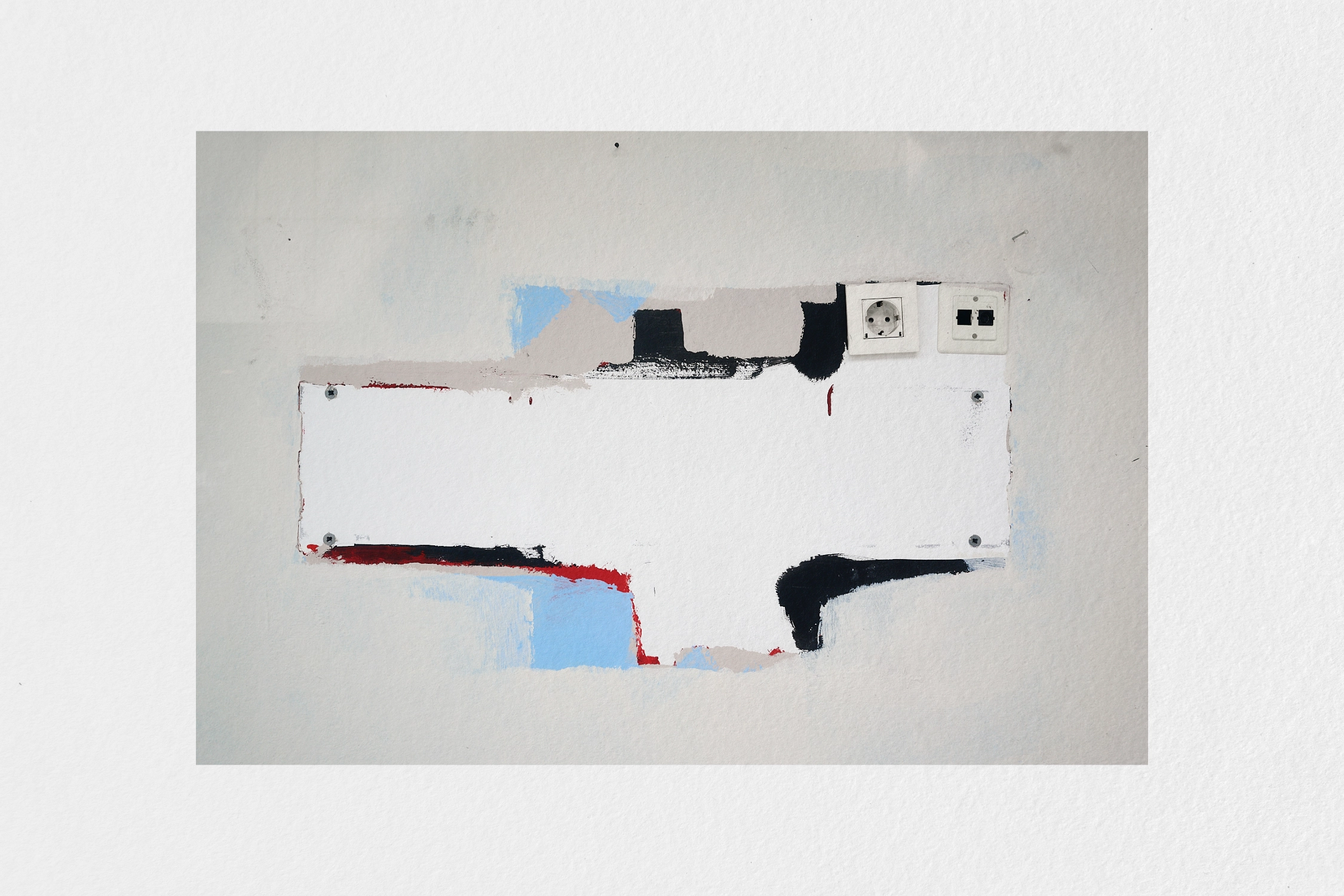 Photographed in Prague in 2024, I took this photo at a contruction site. It totally reminded me of a classic abstract painting. The only thing showing this is a photograph are the two power outlets and the nails.